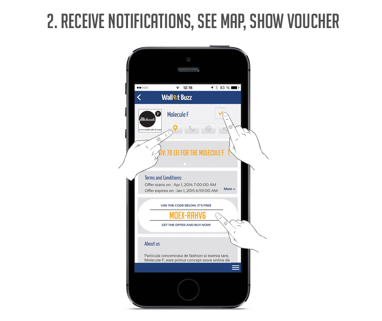 Folosind Platforma de Mobile Marketing, ofertele dumneavoastra sunt promovate direct catre utilizatori, prin aplicatia Wallet Buzz, acestia accesand produsele sau serviciile comerciantilor cu ajutorul unui voucher unic generat pe telefonul mobil.